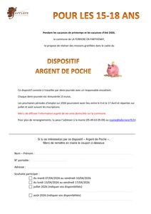 Pendant les vacances de printemps et les vacances d'été, la municipalité renouvelle le dispositif "Argent de Poche" pour les jeunes de 15 à 18 ans. Les inscriptions sont à déposer au secrétariat de mairie.